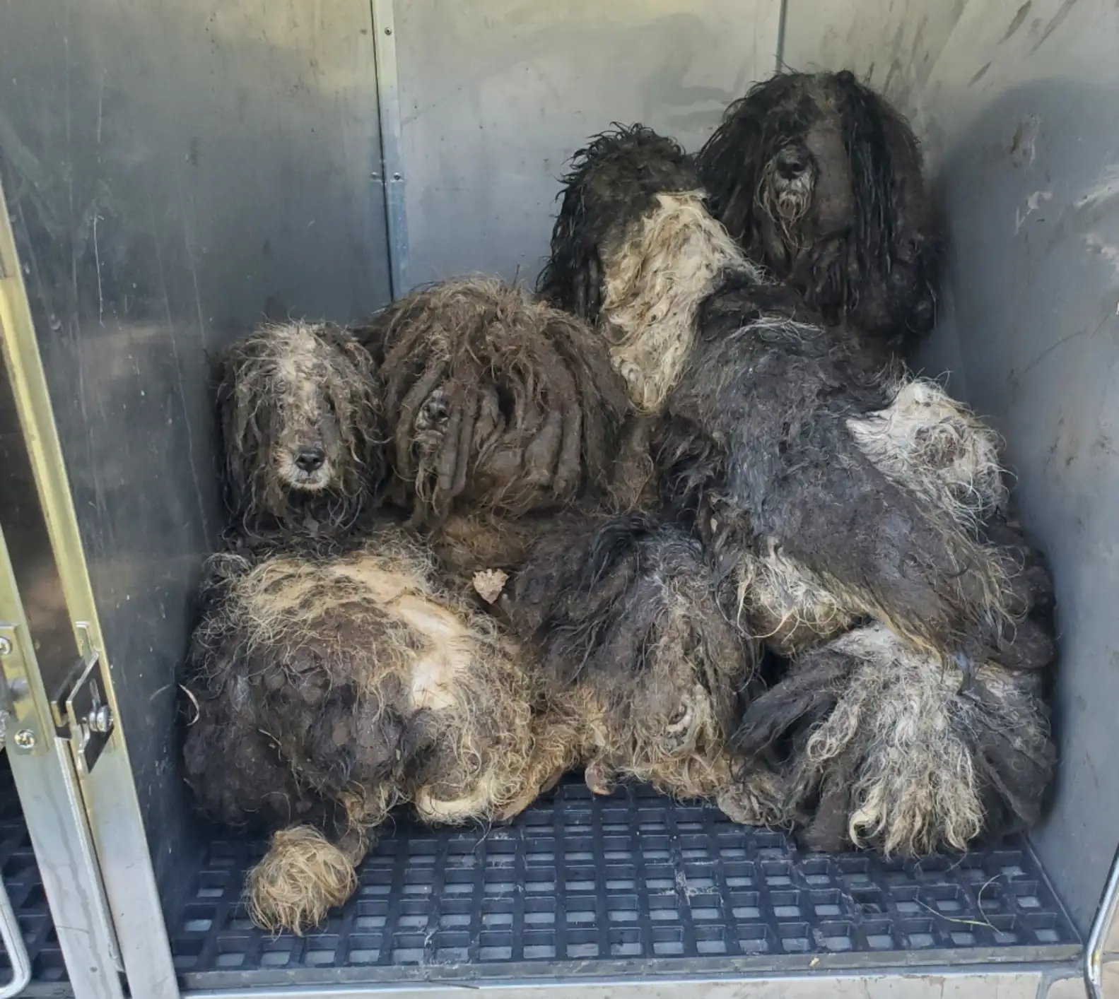 Several furry lumps huddled together near the pond, almost moving as one big creature. Looking closer, the officers realized they were seeing 15 small dogs with wads of matted fur hanging off their tiny bodies.